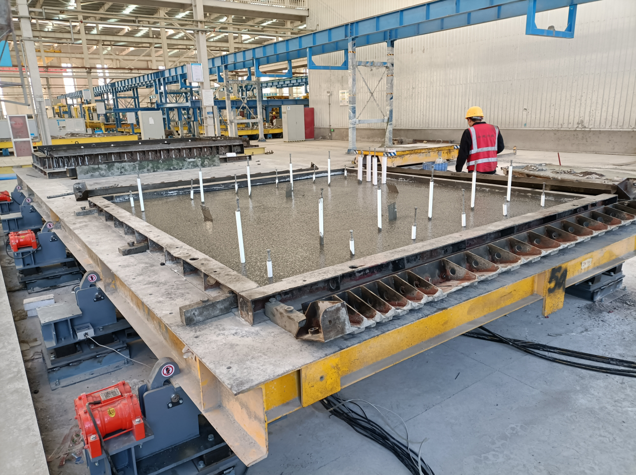 該振動臺可集成在平模流水生產線應用,也可在簡易生產線單機使用,操作方便,可高效振動密實各類混凝土構件,振動噪音低,構件密實度高、質量好。